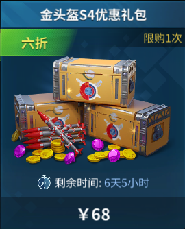 金头盔S4优惠礼包:[能量水晶颗粒]*5000,[能量水晶]*120,[低级装甲卡]*10