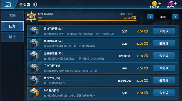 金头盔任务分为10周,每周有10个任务。每周任务分为白银版任务和黄金版任务,各占一半。只有进阶至黄金版才能开启黄金版任务,任务类型丰富多样,任务难度高低不一。完成任务是快速获取金头盔积分的重要途径,飞行员们可以在游戏内探索模式、对战匹配、升级科技、好友组队等多种操作可以达成不同的任务,如签到达人、闪电低潜、混乱缔造者等任务,游戏内有100个任务等待达成,可玩性极高!