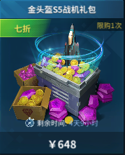 金头盔S5战机礼包(648RMB): [FA-35K天狮星]*1,[钻石]*7500,[金币]*200000,[能量水晶]*400