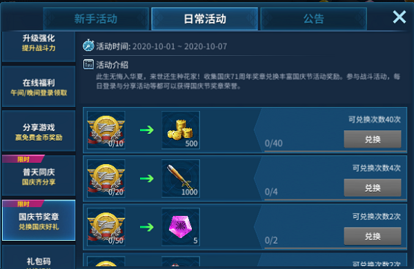 1.[2020国庆节奖章]*10,兑换[金币]*500(兑换限制次数:40次)