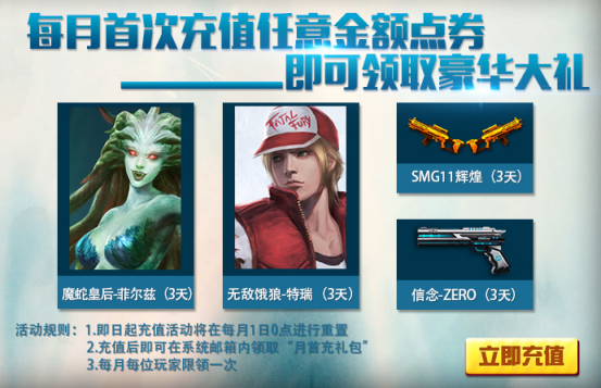 活动内容:玩家充值任意金额即可获得魔蛇皇后-菲尔兹、无敌饿狼-特瑞、SMG11-辉煌、信念-ZERO(3天)豪华组合礼包。
