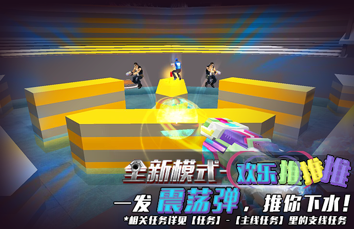 玩法简介:欢乐推推推采用3V3回合制,先达到胜利目标数的一方将取得回合胜利。双方使用欢乐推推推模式专属武器——震震枪,朝敌人发射震震弹,震震弹会将范围内的敌人弹飞,并造成小额伤害。若被推下水或血量为0时,则视为死亡,死亡后将在复活点复活。