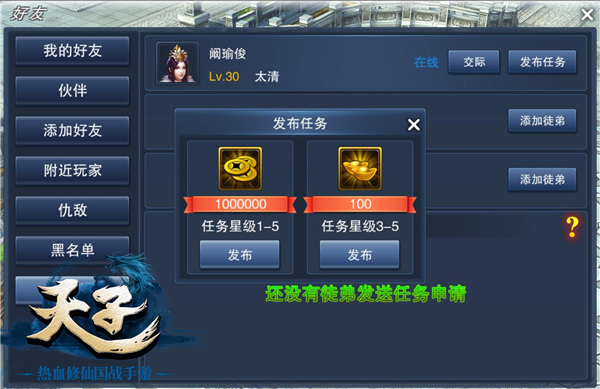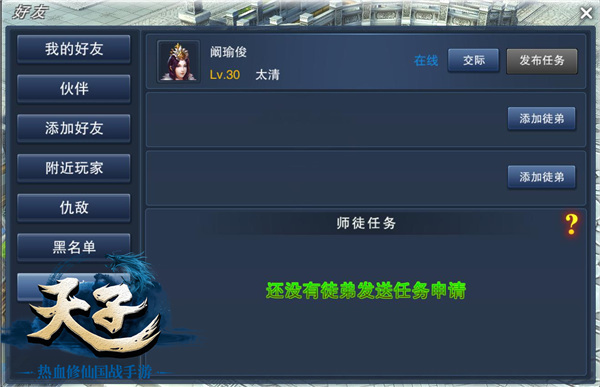 还在纠结自己的升级速度不够快?现在《天子》手游全新师徒系统,让每一个玩家都能轻松快速升级!只要你是65级以上玩家,没有拜师在其他人门下,点击“人物”内“社交”按钮,即可登录到“师徒”界面,随机或指定某玩家缔结师徒关系。搭配全新的“教学任务”系统,无论你是师徒中的哪一方,你都能够因为这一系统而获益良多!