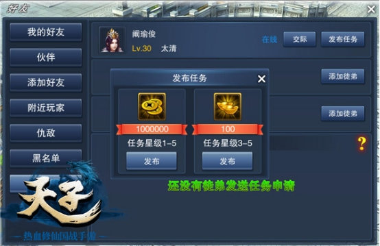 还在纠结自己的升级速度不够快?现在《天子》手游全新师徒系统,让每一个玩家都能轻松快速升级!只要你是65级以上玩家,没有拜师在其他人门下,点击“人物”内“社交”按钮,即可登录到“师徒”界面,随机或指定某玩家缔结师徒关系。搭配全新的“教学任务”系统,无论你是师徒中的哪一方,你都能够因为这一系统而获益良多!
