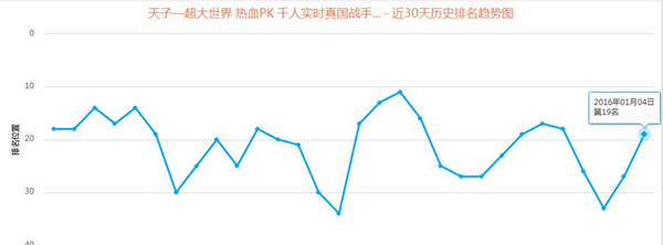 11月25日,由蜗牛游戏推出的平民国战动作手游《天子》开启双平台公测,自游戏11月25日登陆App Store以来,在无代言、无推广的情况下,上线首日便获得付费榜前三位,畅销榜前30位等惊艳成绩,后续表现也十分稳定,截止2016年1月4日一直稳居在畅销榜前30位之间,超越众多强IP、重广告类游戏,成为2016年初手游业中最为抢眼的一匹黑马。