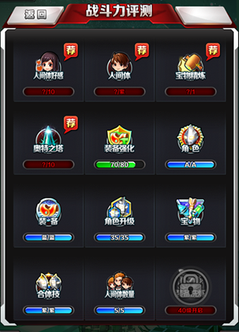 新玩家们通常会觉得,战斗力评测系统中有这么多需要提升的东西,究竟应该从何下手呢。其实,只要细心观察,战斗力评测系统中已经自动为大伙儿推荐了当前最急需提升的方面,我们只需要简简单单的跟着去做就好。理你一方面,对于高玩们而言,战斗力提升系统更准备了精准的提升效果百分比计算。想要将有限的资源投入到性价比最高的地方?那就挨个儿点开看看吧!