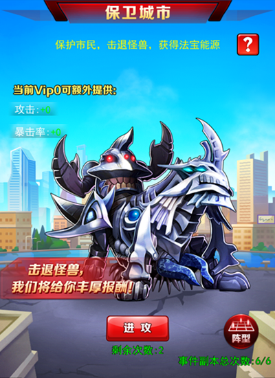 抵御了怪兽入侵,守卫了人类城市的和平,接下来,大伙儿就该享受胜利的果实了。“保卫城市”事件将根据玩家朋友们在五回合内对怪兽输出伤害的多少,评判最后的奖励额度,若是达到对应的伤害,还可获得额外奖励。