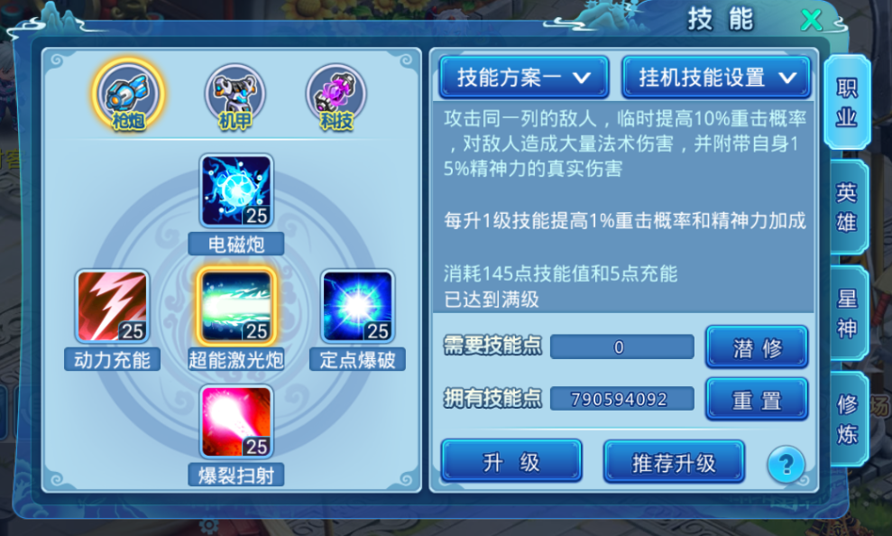 超能激光炮:攻击同一列敌人,临时提高10%重击概率,对敌人造成大量法术伤害,并附带15%精神力的真实伤害。消耗5点充能。每升1级技能提高1%重击概率和精神力加成。