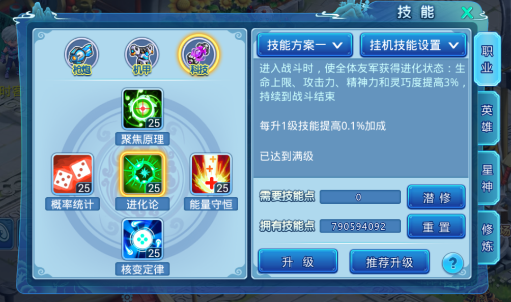 进化论:进入战斗时,使全体友军获得进化状态:生命上限、攻击力、精神力和灵巧度提高3%,持续到战斗结束。每升1级技能提高0.1%加成。