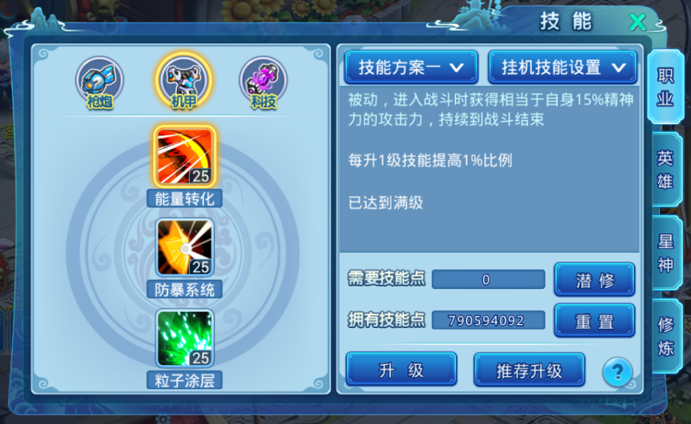 能量转化:被动,进入战斗时获得相当于自身15%精神力的攻击力,持续到战斗结束。每升1级技能提高1%比例。