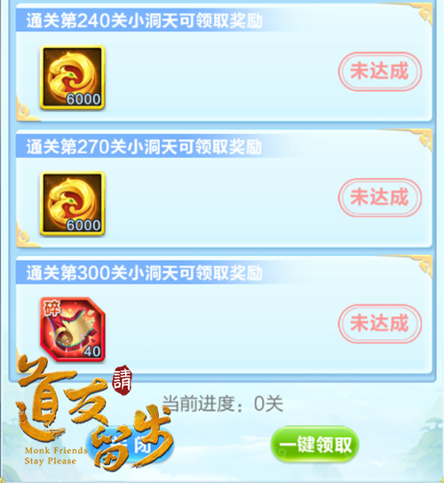 除了商店福利以外,“仙缘洞天”玩法还设有通关奖励。玩家打到指定通关数,可以领取对应福利:仙缘币、宠物要诀碎片等宝物通关就送。