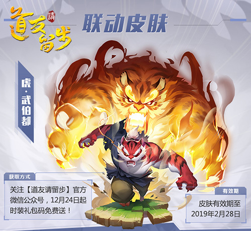 《道友请留步》推出特别联动款皮肤,看看这个霸气十足的武伯都老虎皮肤,想象着换上他,威风凛凛地驰骋在《道友请留步》玄幻世界里呼风唤雨,组建自己的神仙阵容,所向披靡!更重要的是,免费送!没有错,只要你关注“道友请留步”官方微信公众号,12月24日即可免费领取皮肤,助你修仙之路如虎添翼!