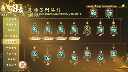 神州万里庆华诞,丰盛好礼贺国庆。万众期待的十一黄金周已经到来,相信不少少侠对国庆假期早有规划。为了让各位少侠的假期生活更加丰富,《大唐无双》手游在9月30日至10月14日倾情推出趣味十足的烧脑欢乐的动物大赛、国庆暖心减负等一系列精彩活动,同少侠们喜笑颜开地嗨翻整个国庆假期!除此之外,在9月30日至10月7日还有时限小当家厨神副本等你来挑战!