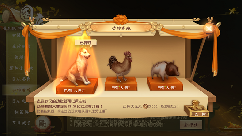 少侠们行走《大唐无双》手游的江湖里,自然少不了碰到血雨腥风,但也不缺乏趣味又搞笑的比赛。本次《大唐无双》手游在国庆假期推出动物赛跑,等级达到30级的少侠可以在每天10:00-19:50期间前往节日使者处押注。少侠可以将所有筹码压给鸡狗猪中的一种,比赛结束后根据动物赛跑名次的不同发放相应的奖励。