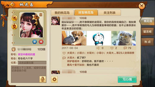 《射雕英雄传手游》手游在本次资料片中将推出全新社交玩法“朋友圈”,为闯荡射雕江湖的各位少侠提供了一个更加立体、人性化的社交平台。擂台挑战成功,爆出好装备,良辰美景佳人相伴……每个值得铭记的时刻和幸福的点滴,势必都需要来一发“朋友圈”!同时让美好继续,让真情长留,让江湖各路侠士也能时刻了解自己的最新动态。还可时刻关注好友动态,留言、评论,使其看到你对其心情的表态。