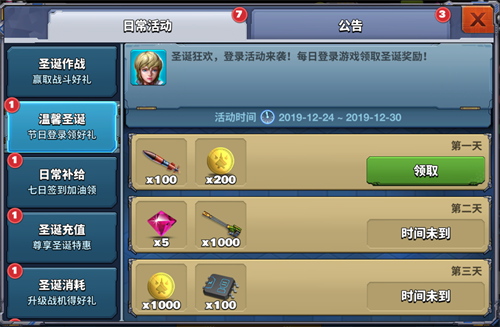 每日充值:圣诞福利大放送,每日充值钻石领不停!圣诞特惠活动期间,每日充值指定钻石,领取圣诞优惠大礼包!