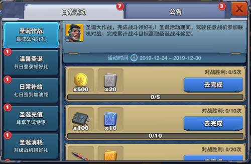 圣诞大作战,完成战斗领好礼!圣诞活动期间,驾驶任意战机参加联机对战,完成累计战斗目标赢取圣诞战斗奖励。