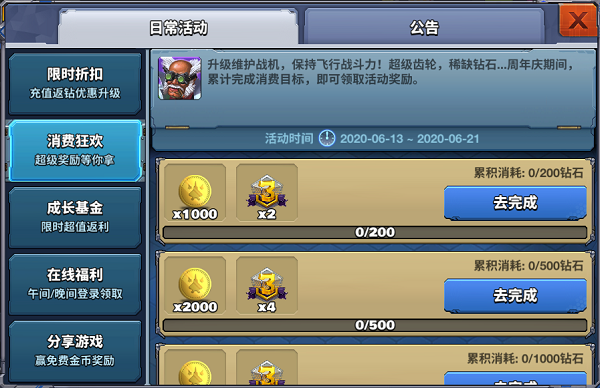 1. 累计消耗钻石*200,奖励金币*1000,3周年奖章*2