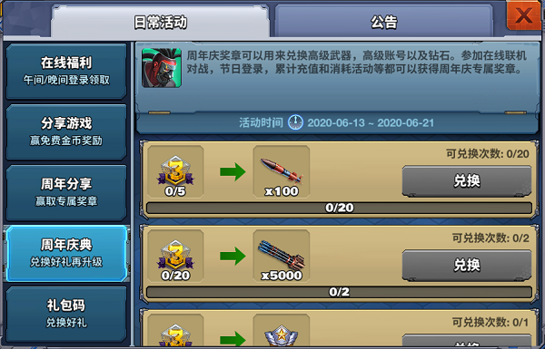 周年庆奖章可以用来兑换高级武器,高级账号以及钻石。参加在线联机对战,节日登录,累计充值和消耗活动等都可以获得周年庆专属奖章。