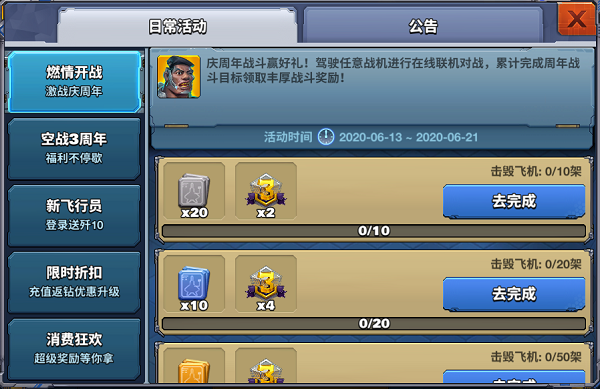 5. 累计击毁200架飞机,钻石*100,3周年奖章*10