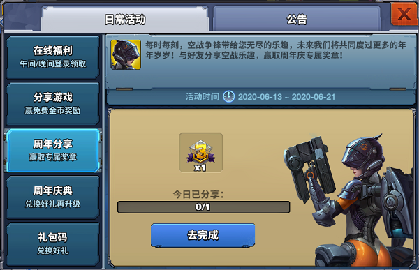 每时每刻,空战争锋带给您无尽的乐趣,未来我们将共同度过更多的年年岁岁!与好友分享空战乐趣,赢取周年庆专属奖章*1!