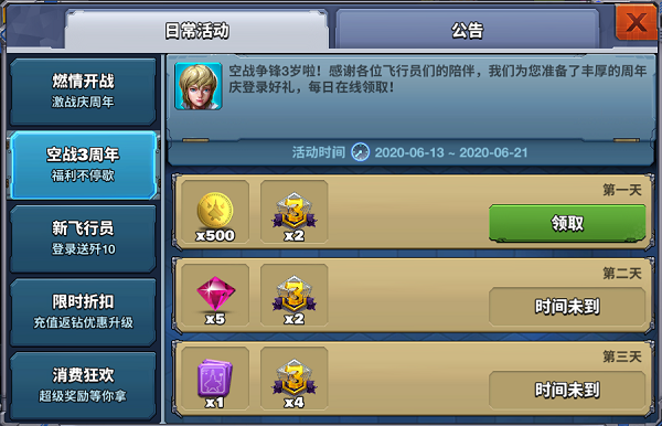 空战争锋3岁啦!感谢各位飞行员们的陪伴,我们为您准备了丰厚的周年庆登录好礼,每日在线领取!