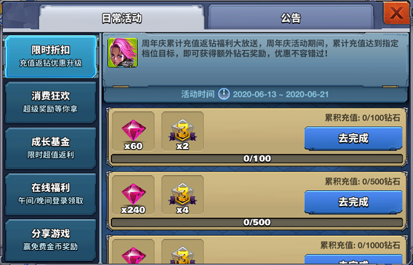 周年庆累计充值返钻福利大放送,周年庆活动期间,累计充值达到指定档位目标,即可获得额外钻石奖励,优惠不容错过!