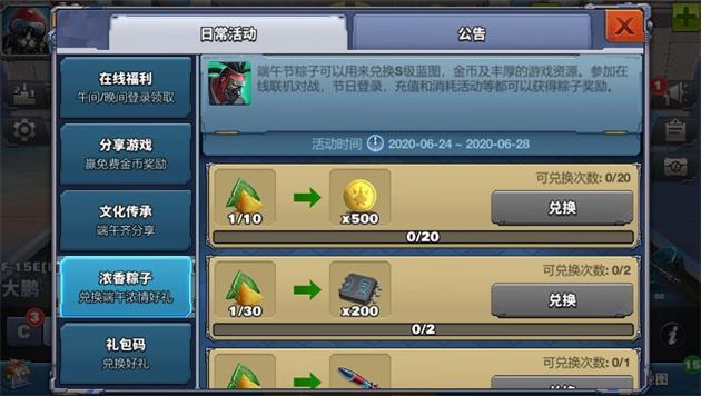 端午节粽子道具可以用来兑换飞机蓝图,武器及丰厚的游戏资源。参加在线联机对战,节日登录,充值和消耗活动等都可以获得粽子奖励。