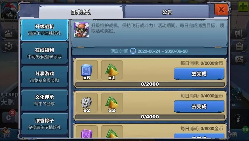 端午粽情战斗,驾驶任意战机进行在线联机战斗,每日完成对战目标,赢取端午战斗好礼!