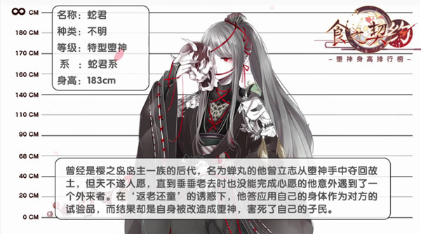 蛇君是蛇君胚胎一定概率下净化的堕神,是堕神族群的颜值担当。作为樱之岛岛主的后代。蛇君擅长妖术。作为Boss时,能面之下的双眼能够夺人心魄,不慎窥视到的人将丧失一切心智。触发特技——自爆人形时,还会放出蛇君傀儡将对敌人发起决死冲锋,同归于尽。