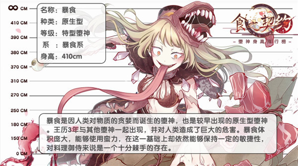 相比身高183CM的蛇君,暴食就显得巨大无比。作为“餐桌上的小黑洞”它的舌头长到无边。Boss战时拥有强大的群体控制和吞噬技能。如果你有红茶、巧克力、小馄饨、红酒、水信玄饼飨灵,记得装备暴食,威力倍增。