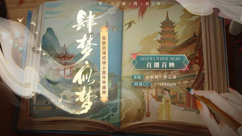 1月20日晚20:00,一梦江湖四周年线上实景嘉年华庆典即将开启,五湖四海的少侠们聚焦于此刻,共赏江湖大美,我们在直播间不见不散!