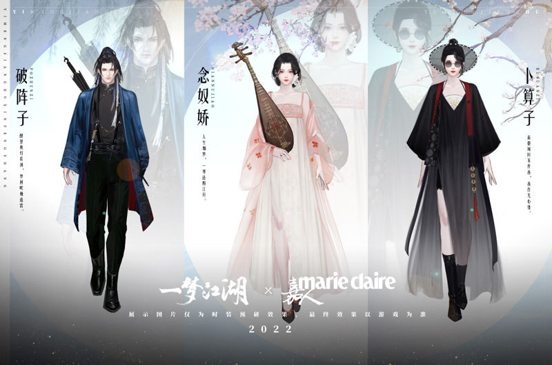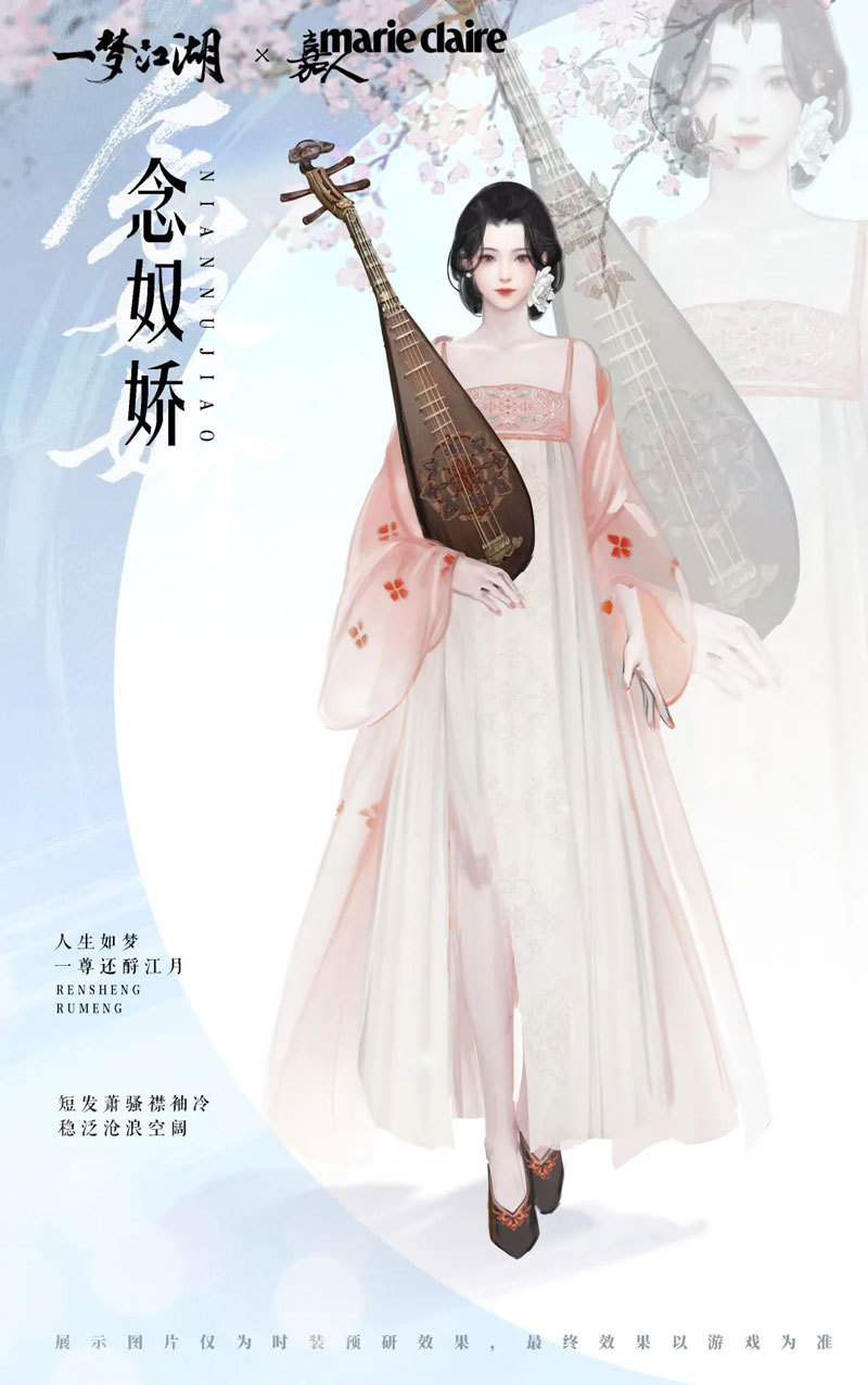 我们与中国头部时尚杂志《嘉人marie claire》推出“风与雅”主题的文艺诗词联动企划,在游戏内,我们将推出两套以古代传统诗词为主题的时装卜算子和破阵子·念奴娇,这两套时装设计取意自同名词牌名,不仅蕴含了古代文学作品中包含的美好意向,还融合了颇具时尚感的国风设计。