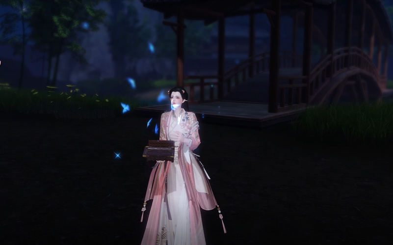 紫檀木盒镶着金边,每一次打开都会有不同颜色的蝴蝶从匣中飞出,蓝蝶梦幻、红蝶明艳、金蝶灿烂……少侠轻轻抬手放出款款飞舞的蝴蝶,将它们送归自然,灵动的蝶儿渐飞渐远,好似光影在空中跃动,如梦似幻。