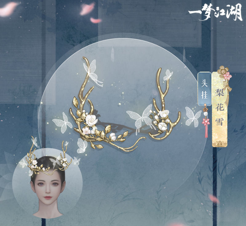 芳菲春二月,踏青好时节。云锦楼小师傅在早春踏青之时,于林间见一小鹿头带白色梨花,还有蝴蝶绕着翩翩起舞,小师傅将这生趣盎然之景记录下来,制成头挂·梨花雪。梨花雪以枝叶缠绕成鹿角的形状,清丽的花朵盘踞在金枝玉叶之上,叶脉清晰可见,枝干金光掠影,颇有质感。