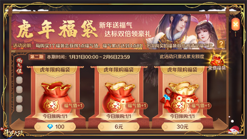 《新斗罗大陆》新春超级福利-超值限购福袋满载而来,福袋每日刷新,购买福袋即可获得福气值,福气值积满之后购买福袋会产生双倍暴击哦!