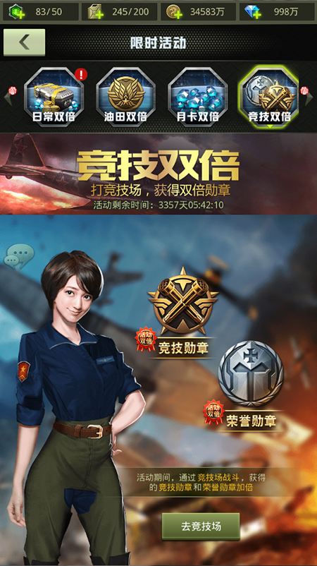 竞技双倍可以令活动期间的竞技场中竞技勋章、荣誉勋章获取量翻倍。竞技勋章可以在竞技商店换取主力战机碎片,荣誉勋章是提升军衔的主要材料,依靠军衔提升来获得战力提升。