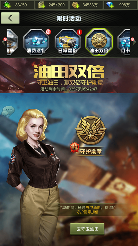 油田双倍活动可以让指挥官在守卫油田时每关卡获得的守护勋章加倍,从而达到一天刷出两天的守护勋章的效果。