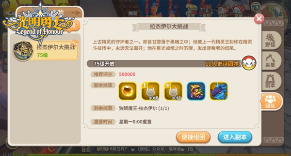 盛大首款3D萌系超自由冒险手游《光明勇士》拉杰伊尔大挑战全新10人史诗副本开启。通关拉杰伊尔大挑战10人史诗难度,就有机会获得80级金色武器魔核、冰龙科罗塞坐骑(14天)以及光明玉等奖励!