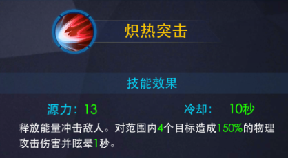 “炽热突击”用能量冲击敌人,造成范围伤害并且造成晕眩。
