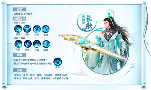 长歌属于远程职业,以抚琴作为武器。他召唤音符随机伤害特定范围的敌人,每次攻击都将给敌人带来最沉痛的打击。远程爆发和治疗输出是他的双流派系,以及持续刷新技能CD的能力,让他在PK或副本中都能游刃有余。