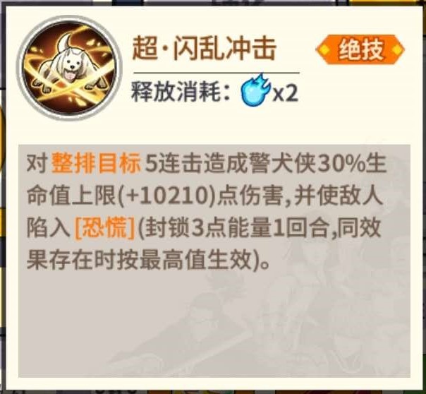 绝技集伤害与限制于一体,伤害与自身生命值相关,享受暴击率、暴击伤害、伤害率等加成,伤害上限很高,同时附加恐惧效果,封锁对手2点能量,很好地起到了限制对手的作用。超绝技则进一步加强警犬侠的伤害和限制能力。