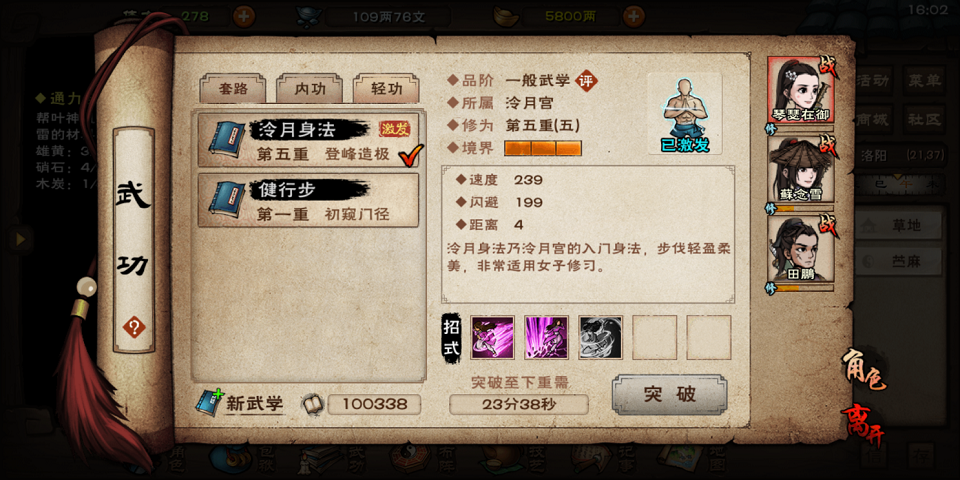 游戏中有着武功系统,武功系统分为进攻套路、内功、轻功三种,每种武功都有基础武学、一般武学、进阶武学等。
