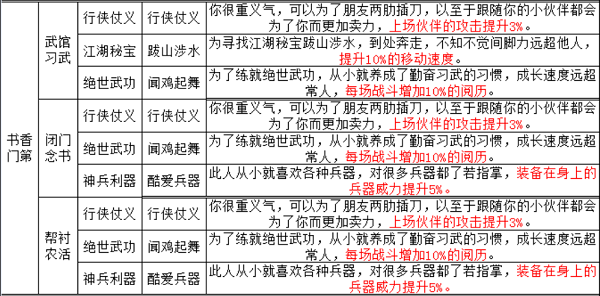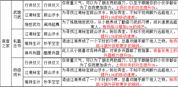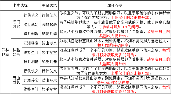 而烟雨江湖(代号江湖)二测中的出生天赋则有5种,分别为:1、行侠仗义:上场伙伴的攻击提升3%。2、闻鸡起舞:每场战斗增加10%的阅历。3、酷爱兵器:装备在身上的兵器威力提升5%。4、跋山涉水:提升10%的移动速度。5、妙手空空:每场战斗额外获取更多的银两。