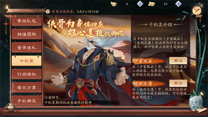 版本开启后,将率先在“少室风云”和“仗剑之道”中加入千机变玩法,玩家进入少室风云将体验全新“幻身模式”——获得一个化身技能,使用后随机变身成为某个侠客,持续一定时间。化身后将继承自身的属性,并使用侠客的技能进行战斗。“仗剑之道”则加入“无双模式”——玩家参与仗剑之道时,普通技能将拥有近乎无限释放的超短技能CD,全新的战斗体验,即将尽情释放!
