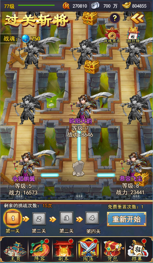 7. 每天有一次免费重置关卡的机会,重置后从第一关开始,挑战次数恢复16次
