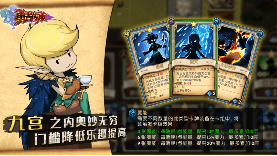 游戏中共有6类共48张卡牌,每次冒险都可以选择不同的技能卡牌,保证冒险的差异性。每收集2张相同卡牌可以提升卡牌的能力,丰富的卡牌组合效果,收集每一个卡牌都是有意义的。