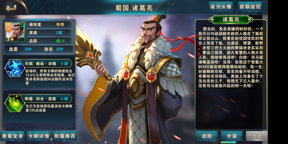 游戏中英雄卡牌,可以通过进阶,升星,飞升,变身等功能提升名将的属性值。